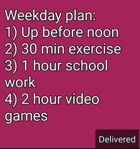 For the past week and a half I’ve been allowing my kids to sleep in and stay up late, playing video games in their rooms all day. However, I’ve been listening to Celebrate Calm parenting podcasts and now I’m feeling motivated to be more intentional and proactive with engaging my kids in healthier daily activities. We will see how I feel about it in the morning, but after talking with the kids this evening, I think they understand that their state of total freedom is ending. They were laughing and joking and even offering up ideas for activities. So tomorrow I’m going to try to stay up when my alarm goes off at 7 am. I’ll have my coffee and devotional time with Jesus, and then I’ll scribble out a daily plan. Hopefully a plan better than the one I proposed this afternoon (pictured below).