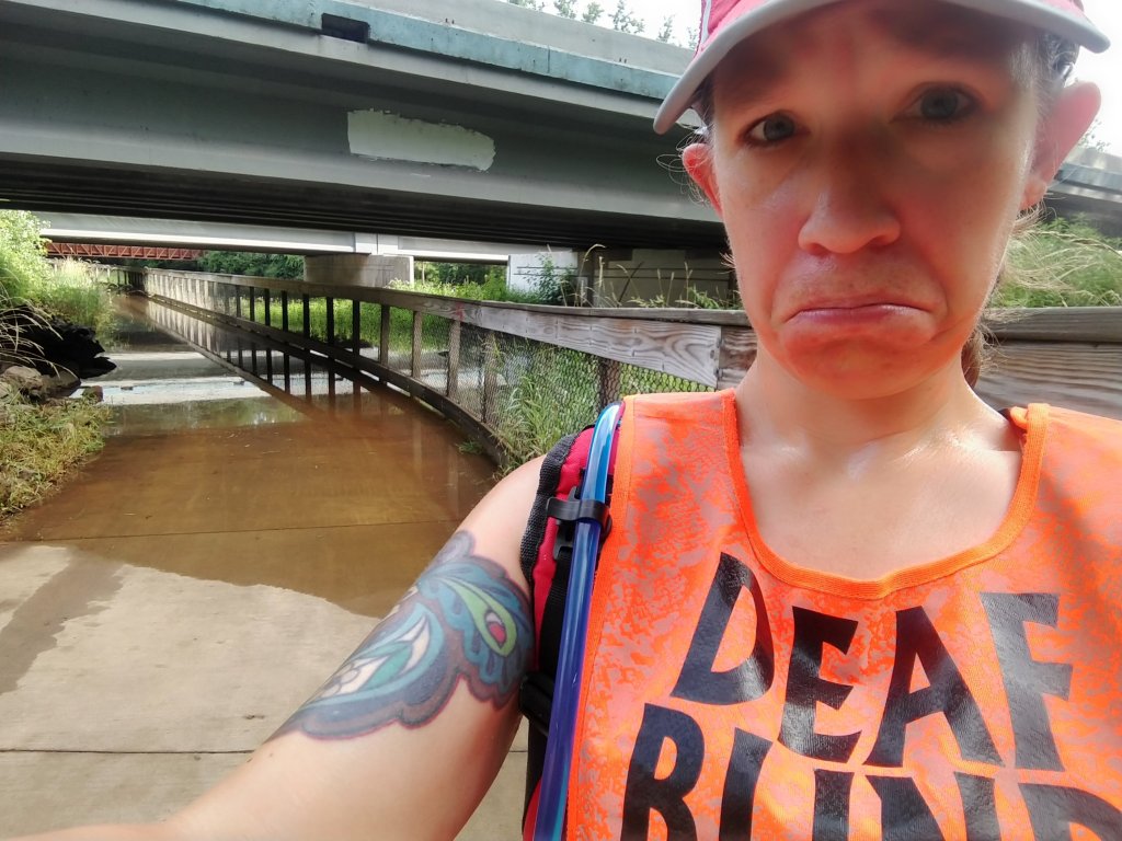 We are in the thick of it, folks. Marathon training. I knew it was going to be hard, but this run was certainly a test of my endurance, my persistence, my commitment to the goal. I had the perfect route planned, 7.5 miles to the park and back to make my scheduled 15. I was so excited to accomplish this! And yet, it wasn’t to be. As you can see from the photo below, I encountered some flooding, and there was no way around it. This was a bridge that goes under the highway, and I’ve since been told that it floods often, because it dips so low. It could have been possible to run through it, as I saw a man on a recumbent tricycle riding right through it, but that wasn’t something I was willing to do. So I took a sad face selfie and headed back the way I came. This roadblock was only 1.5 miles away from my half way point, which meant that I had to make up 3 miles of distance to achieve my 15. So I took all the loops I could. Ran around all the cul-de-sacs in my neighborhood. Willed myself to NOT go home before I reached that 15 miles.
