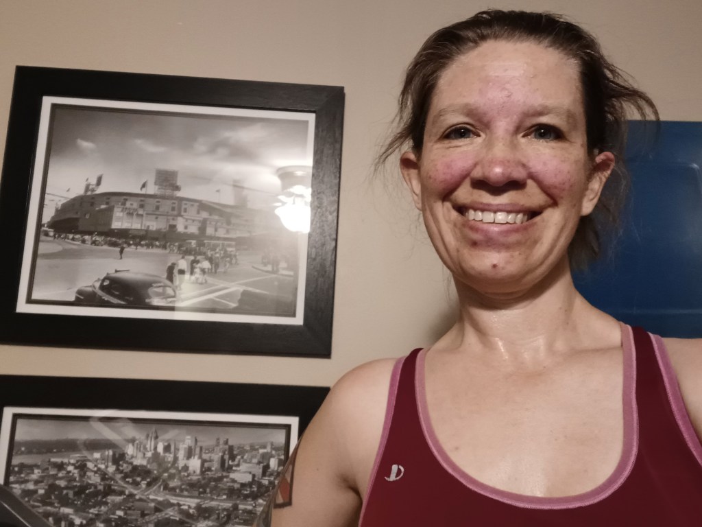 I’m pictured below, post treadmill run in the man cave. You’ll see my hair does some funny things when I sweat. Hanging on the wall to my right are black and white photos of Tiger Stadium, and behind my head is a seatback from the old stadium. I am still not crazy about running on the treadmill, but at least I have the dogs and my husband’s sports memorabilia to keep me company. I’m smiling because I’m done.