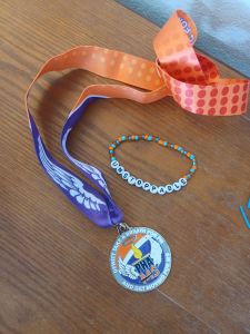 The finisher’s medal and the bead bracelet Allison made for me.