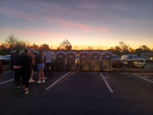 Runners waiting in line for porta-potties with the sun rising in the distance.